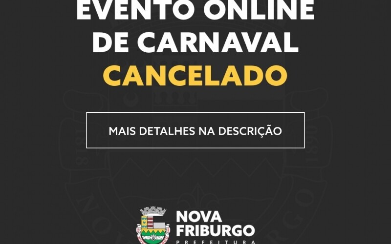 A Prefeitura de Nova Friburgo informa que o evento de Carnaval online, que estava previsto para acontecer de 12 a 16 de fevereiro, foi cancelado. O objetivo era a promoção da Cultura com total responsabilidade e sem quaisquer riscos de contaminação por Covid-19. A Administração Pública Municipal está sempre atenta ao posicionamento dos cidadãos, por esta razão pede desculpas e toma esta decisão respeitando os friburguenses que se manifestaram massivamente contrários à programação. No entanto, vale esclarecer para toda a população friburguense que o evento seria totalmente online, transmitido no Facebook da Prefeitura, e havia sido planejado com o único propósito de valorizar a tradição cultural do Carnaval friburguense e sem custos ao município. Ou seja, o Carnaval 2021 online não seria um evento de Carnaval convencional, com shows, blocos e escolas de samba na rua, nem com pagamentos de subvenções por parte da Prefeitura.
