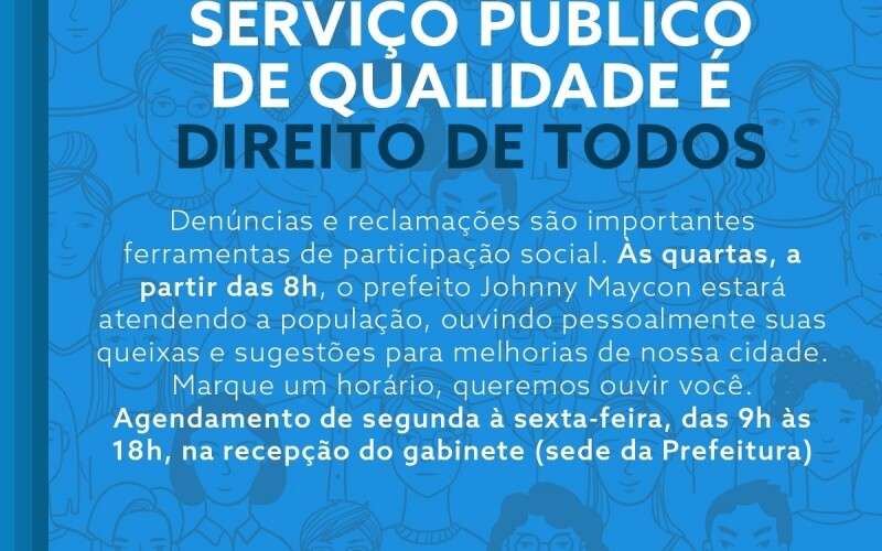 A partir desta semana, as manhãs das quartas-feiras serão reservadas para o prefeito Johnny Maycon receber cidadãos e ouvir demandas em seu gabinete, na sede da Prefeitura. Os interessados podem agendar seu horário com o prefeito na própria recepção do Gabinete, de segunda a sexta-feira, das 9h às 18h.