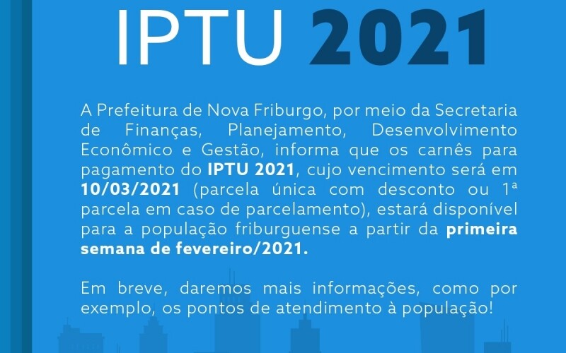 A Prefeitura de Nova Friburgo, através da Secretaria de Finanças, Planejamento, Desenvolvimento Econômico e Gestão, informa que os carnês para pagamento do IPTU 2021, que terá seu vencimento em 10/03/2021 (parcela única com desconto ou 1° parcela em caso de parcelamento), estará disponível para a população friburguense a partir da primeira semana de fevereiro/2021.