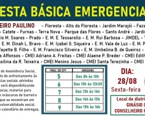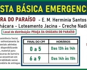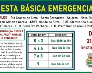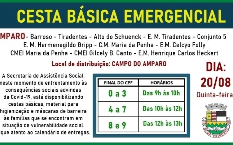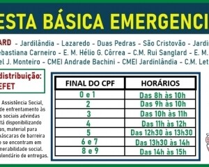 A Secretaria de Assistência Social, neste momento de enfrentamento às consequências sociais advindas da Covid-19, está disponibilizando cestas básicas, material para higienização e máscaras de barreira às famílias que se encontram em situação de vulnerabilidade social. Fique atento ao calendário de entregas da primeira semana.