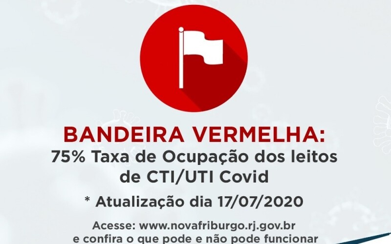 Considerando a taxa média de ocupação dos leitos de CTI/UTI, específicos para tratamento de casos suspeitos e confirmados de Covid-19, dos hospitais público e privados, a Prefeitura de Nova Friburgo informa que a Bandeira VERMELHA entrará em vigor, a partir da próxima segunda, dia 20, e se estende até o domingo, dia 26.