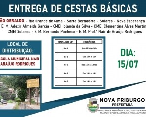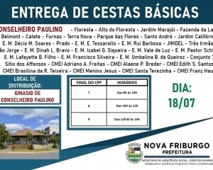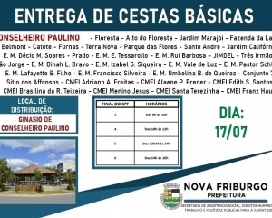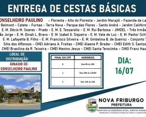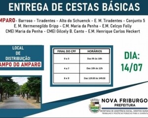 Nesta terça-feira, 14, no distrito de Amparo, a Prefeitura de Nova Friburgo inicia mais uma ação importante no atendimento às pessoas em vulnerabilidade social ocasionada pela pandemia da Covid-19, a terceira remessa de cestas básicas. A entrega será feita em horários separados pela sequência crescente do último número do CPF do cadastrado, e o cronograma seguirá a ordem com final de 0 ao 9, em todos os locais de entrega. O acesso e permanência no local não será permitido sem o uso de máscaras de barreira.