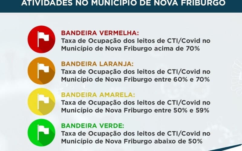 O decreto 625 determina a abertura de segmentos, tendo como parâmetro regulador a taxa média de ocupação dos leitos de CTI/UTI para o tratamento da Covid-19 em Nova Friburgo, que definirá as bandeiras vermelha, laranja, amarela ou verde, aferidas semanalmente, sempre às sextas-feiras.