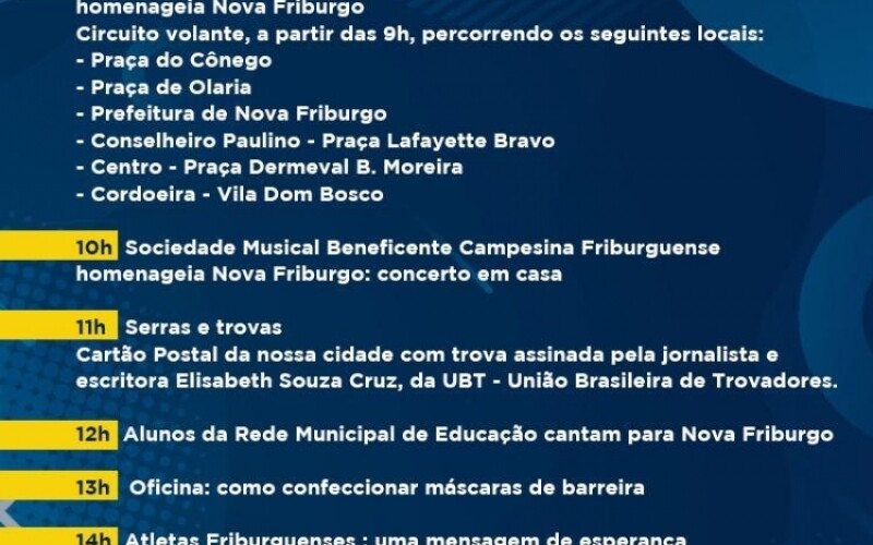 9h – “Muitas vozes, um só hino”. Vídeo com o hino da cidade, cantado por diversas pessoas, como homenagem a Nova Friburgo;