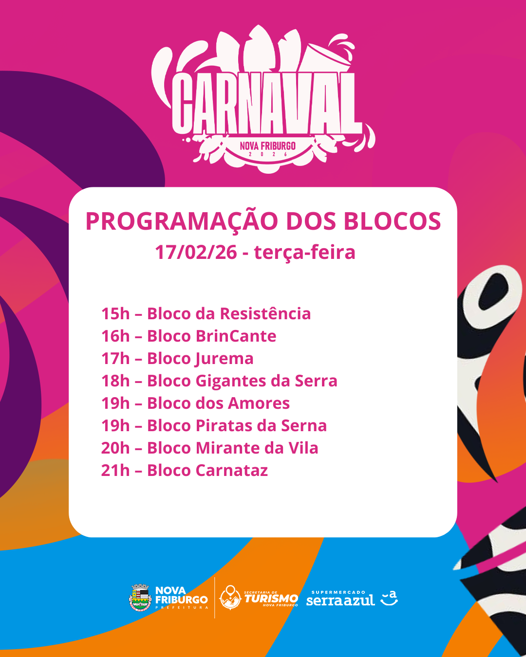 Além do brilho na avenida, o Carnaval de Nova Friburgo também ganha a Alberto Braune com a energia contagiante dos blocos, reunindo foliões de todas as idades em diversos pontos da cidade. Tradição, irreverência, inclusão e muita animação marcam a programação, que promete arrastar multidões e espalhar alegria por todos os cantos.