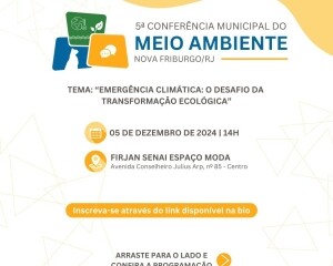 No próximo dia 05 de dezembro, a partir das 14h, na Firjan Senai Espaço Moda, acontecerá a 5ª Conferência Municipal do Meio Ambiente de Nova Friburgo, com o tema “Emergência Climática: o Desafio da Transformação Ecológica”. A realização é da Prefeitura de Nova Friburgo, por meio da Secretaria de Meio Ambiente e Desenvolvimento Urbano Sustentável.