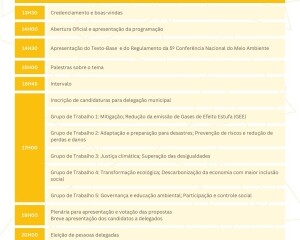 Durante a 5ª Conferência serão ministradas palestras com profissionais da área, como o mestre em Biociências e Biotecnologias, André Bohrer; o geógrafo, Pedro Higgins; o cientista político, Matheus Marlisson e a bióloga Renata Menezes Rocha. Além destas enriquecedoras palestras, também serão apresentadas e votadas as propostas elaboradas durante o evento com base nos cinco eixos temáticos e, ao final, a eleição dos delegados que representarão o município na etapa Estadual.
