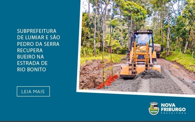 A Prefeitura de Nova Friburgo, através da Subprefeitura de Lumiar e São Pedro da Serra, iniciou na segunda-feira, 18, mais uma ação visando a manutenção das estradas da região do 5º e 7º distritos. A equipe atuou na restauração de um bueiro na estrada de Rio Bonito de Cima.