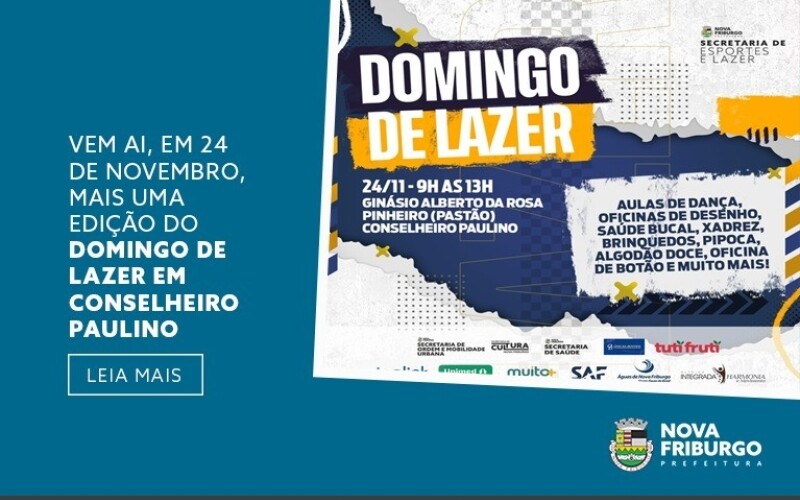 A Prefeitura de Nova Friburgo, por meio da Secretaria Municipal de Esportes, promove mais uma edição do “Domingo de Lazer”, no próximo dia 24, no Ginásio Alberto da Rosa Pinheiro, em Conselheiro Paulino. O evento será realizado das 9h às 13h. Em caso de chuva, será cancelado.