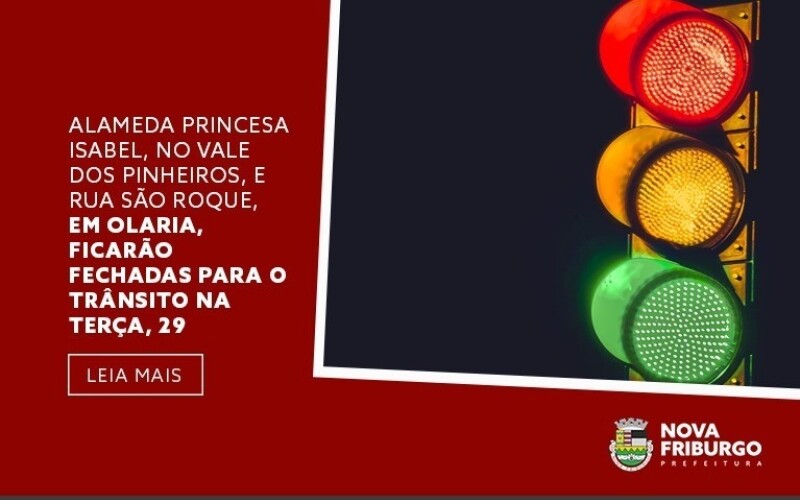 A Prefeitura de Nova Friburgo, por meio da Subprefeitura de Olaria, em parceria com a Secretaria Municipal de Obras, comunica o fechamento de duas ruas na próxima terça-feira, 29 de outubro, para a realização de obras. Ambas as vias ficarão fechadas para o tráfego de veículos a partir das 7h até a conclusão dos trabalhos, prevista para ocorrer até as 16h. As interrupções no trânsito ocorrerão na Alameda Princesa Isabel, no bairro Vale dos Pinheiros, e na Rua São Roque, na altura do ponto final, em Olaria.