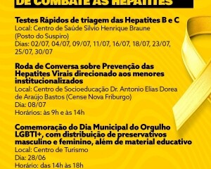 Em comemoração ao Dia Mundial de Combate às Hepatites Virais, em Nova Friburgo, o Programa Municipal de Hepatites Virais estará promovendo ações de prevenção e conscientização, incluindo a realização dos Testes Rápidos de Triagem das Hepatites B e C. O “Julho Amarelo” é a campanha para incentivar a realização dos testes. O Dia Mundial de Luta para a eliminação da doença é 28 de julho, instituído pela Organização Mundial de Saúde, OMS, porém as ações de prevenção acontecem regularmente.