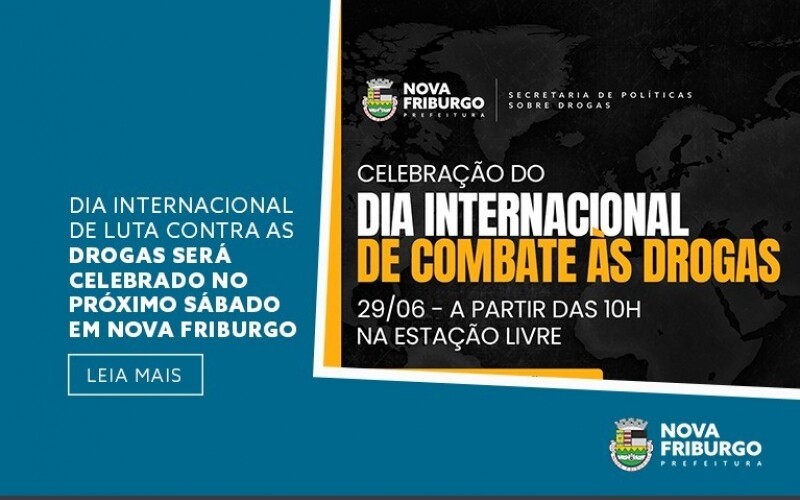 Nesta quarta, 26, é celebrado em todo o mundo o Dia Internacional de Combate às Drogas, no Brasil, o dia também passou a se tornar nacional. Para marcar a data, a Prefeitura de Nova Friburgo, através da Secretaria Municipal de Políticas Sobre Drogas, com apoio da Subsecretaria de Prevenção à Dependência Química do Estado do Rio de Janeiro, irá realizar no próximo sábado, 29, uma programação especial pela data.