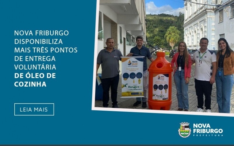 A Secretaria Municipal de Meio Ambiente e Desenvolvimento Urbano Sustentável, junto a concessionária Águas de Nova Friburgo, implantou recentemente três novos pontos de entrega voluntária (PEVs) do Projeto Trata Óleo. Os pontos estão agora disponíveis nas instituições Cederj, Cefet e UFF.