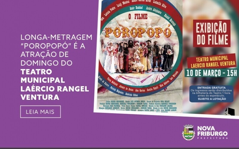Mais um final de semana com muitas atrações culturais em Nova Friburgo. E neste domingo, dia 10, às 15h, o Teatro Municipal Laercio Rangel Ventura terá a exibição gratuita do longa-metragem infanto-juvenil “Poropopó”. O filme foi rodado na cidade de Nova Friburgo, sendo grande parte do elenco de apoio oriundo de grupos teatrais locais.