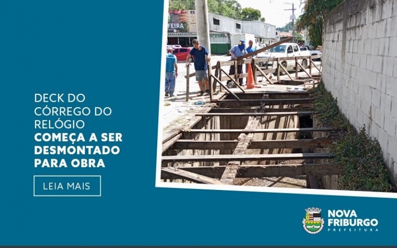 A Prefeitura de Nova Friburgo, por meio da Secretaria de Obras, inciou a desmontagem do deck que cobria o Córrego do Relógio, no bairro Vila Amélia. O local foi interditado em definitivo e um guarda-corpo provisório e emergencial foi montado enquanto é aguardada a obra definitiva.