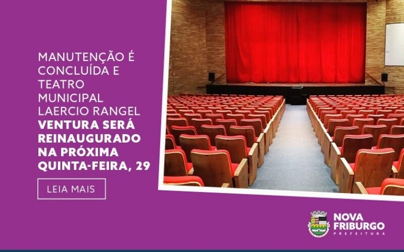 A Prefeitura de Nova Friburgo, por meio da Secretaria Municipal de Cultura, tem a honra de anunciar a reinauguração do Teatro Municipal Laercio Rangel Ventura, que passou por um profundo processo de manutenção, iniciado em março do ano passado, com recursos próprios do Município.