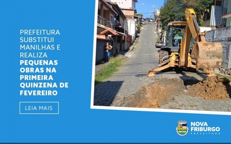 A Prefeitura de Nova Friburgo, através da Secretaria de Obras, realizou, na primeira quinzena de fevereiro, ações de manilhamentos nos bairros Varginha, Chácara do Paraíso e no Centro. Já a equipe de pequenas obras realizou intervenções no Parque Imperial e no Centro. Dentre os serviços de rotina, a equipe de calceteiros fez reparos em ruas de Olaria, Cônego, Varginha e no Centro.