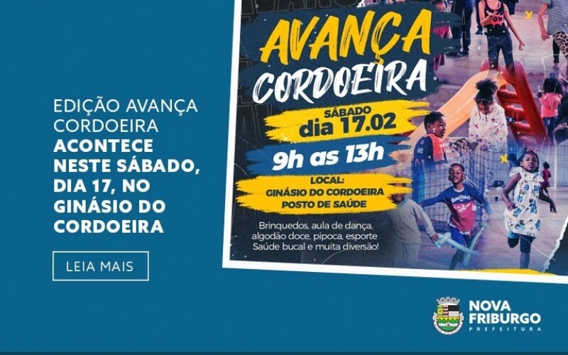 A Prefeitura de Nova Friburgo, por meio da Secretaria Municipal de Esportes e Lazer, com o apoio das secretarias municipais de Saúde e de Cultura, em parceria de empresas privadas, irá promover mais uma edição do avança cordoeira, no próximo sábado, 17, no ginásio do bairro Cordoeira.