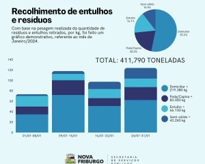 A Secretaria de Serviços Públicos finalizou na última quinta-feira, dia 1, o balanço de janeiro relativo ao recolhimento de entulhos e resíduos. Os números impressionam, totalizando mais de 411 toneladas de materiais recolhidos de vias públicas.
